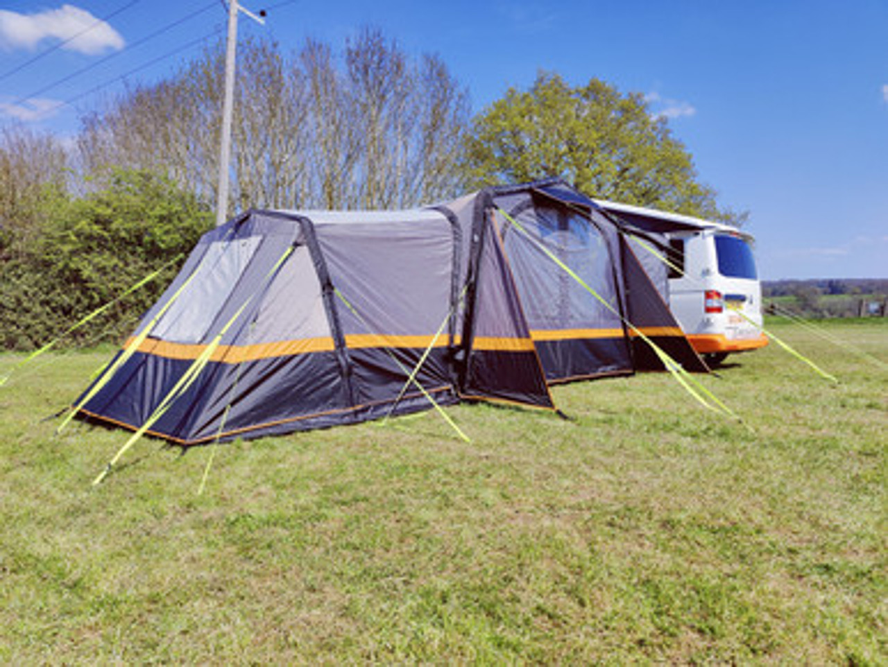 The Cali Breeze® is one of our most versatile Drive Away Campervan Awnings. It includes a 4 berth Inner tent and also comes with a detachable 2 berth bedroom pod for extra sleeping or storage space. The inflatable beams make setting up a Breeze, only taking 20 minutes to erect, much quicker and simpler to pitch than a poled awning.