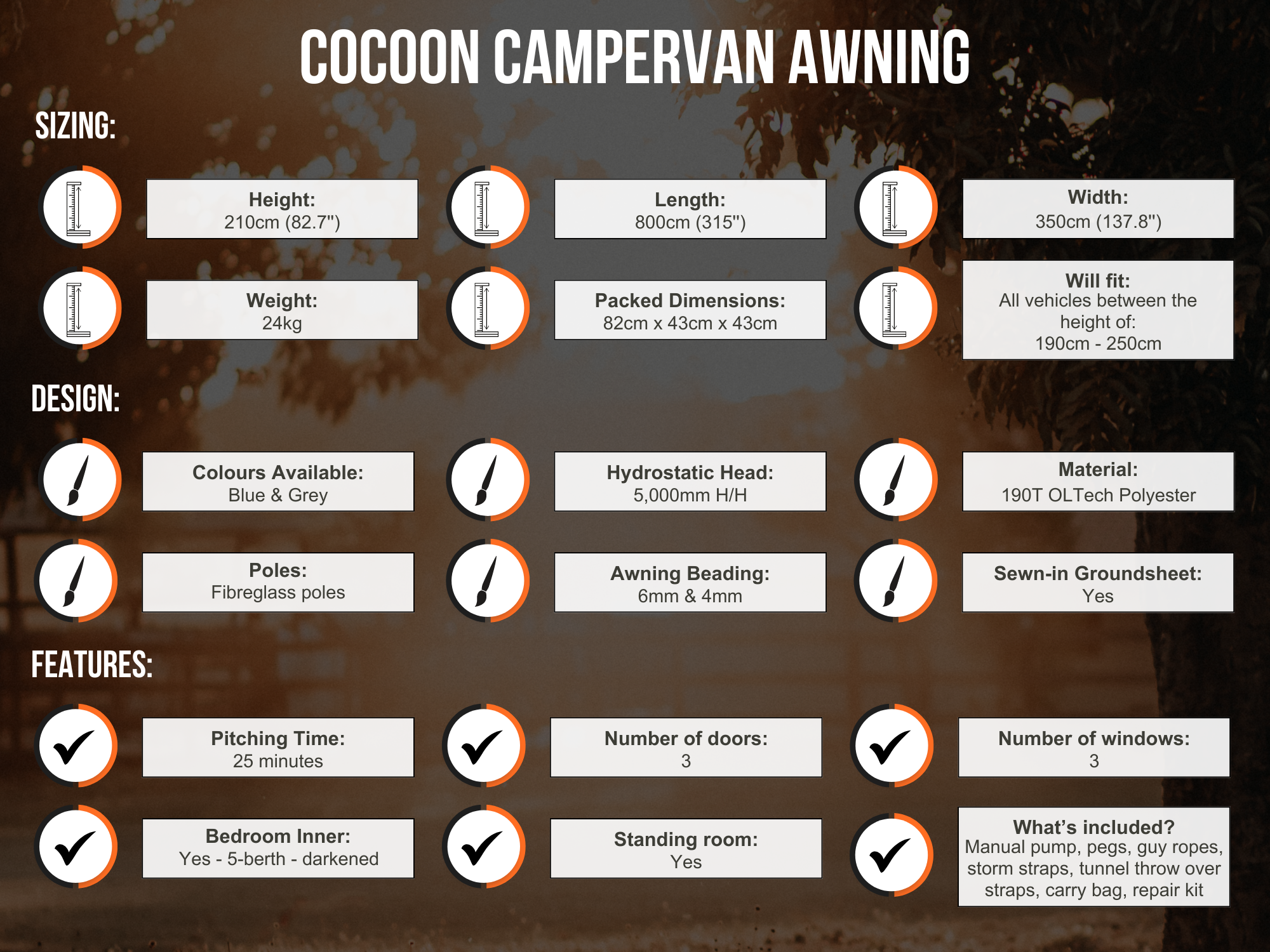 The Cocoon is based on our most popular Drive Away Campervan Awning with plenty of living and sleeping space. It includes a removable 5 berth bedroom inner tent, sewn in groundsheet and a canopy on the front which is perfect as covered storage for bikes, tables, chairs and BBQs. Canopy Poles are included for the side door, there are blinds on all windows and fly mesh on entrances to the awning.