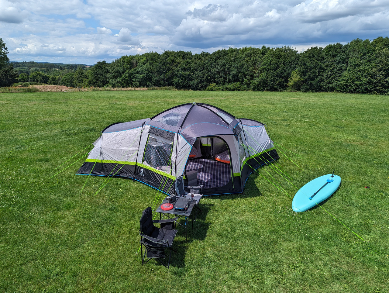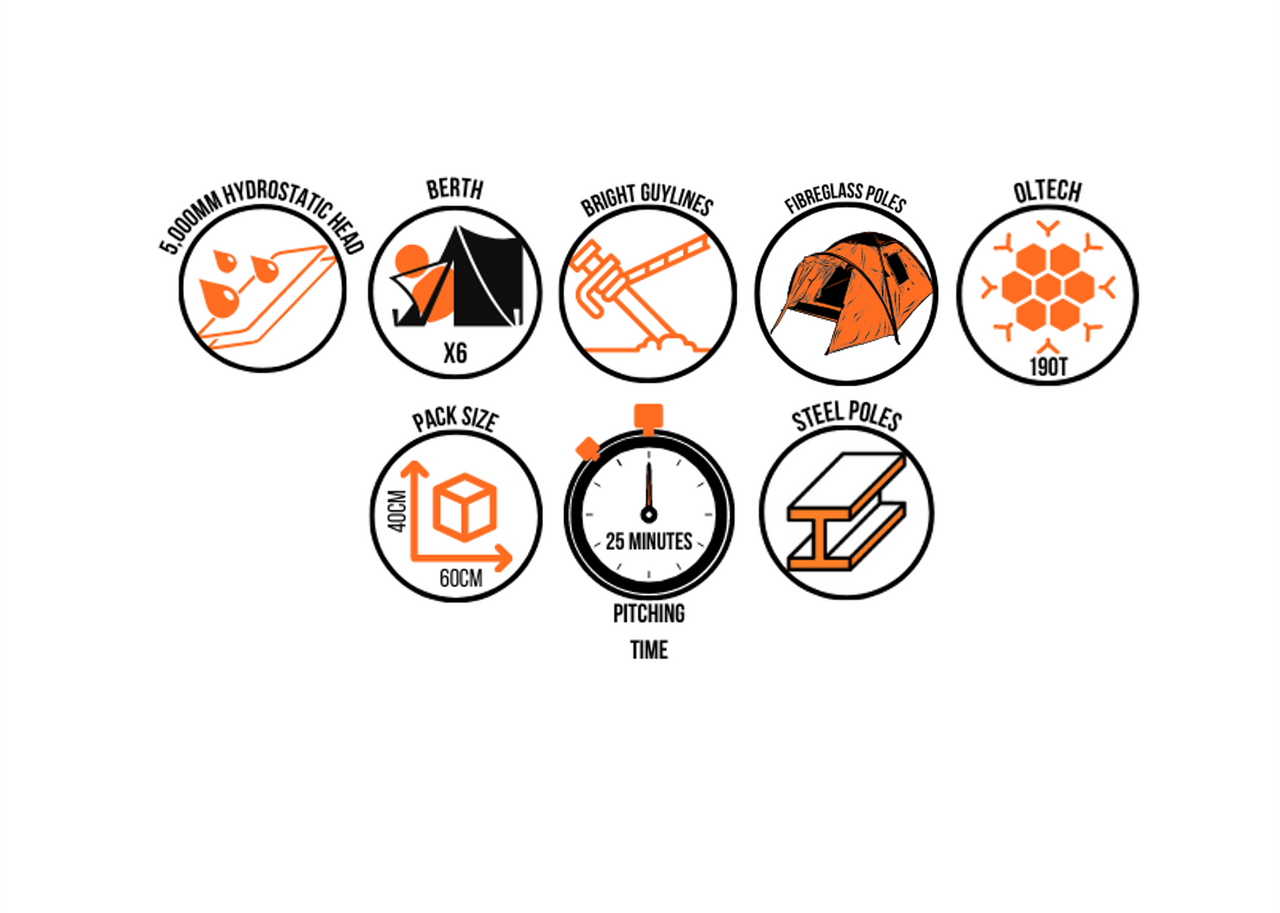 The Hive 6 berth tent has three bedroom compartments which come off the back of a six sided living space. The Hive has two Square windows with closing top vents that offer great views and the skylights in the roof fill the Hive's living area with light. The sleeping pods have a large inner tent that will fit a double air bed or can be removed to enlarge your living space further. The tent is made from an above-standard 190T OLTech Polyester , fully waterproof material, with a rating of 5000 Hydrostatic Head and it also has fully taped seams. The front door has a canopy to protect from the rain. The front door has the benefit of a fly mesh screen for added privacy and to protect you from those pesky bugs. Also comes with a spare bedroom pole because we know accidents happen.