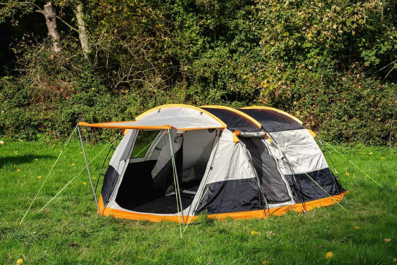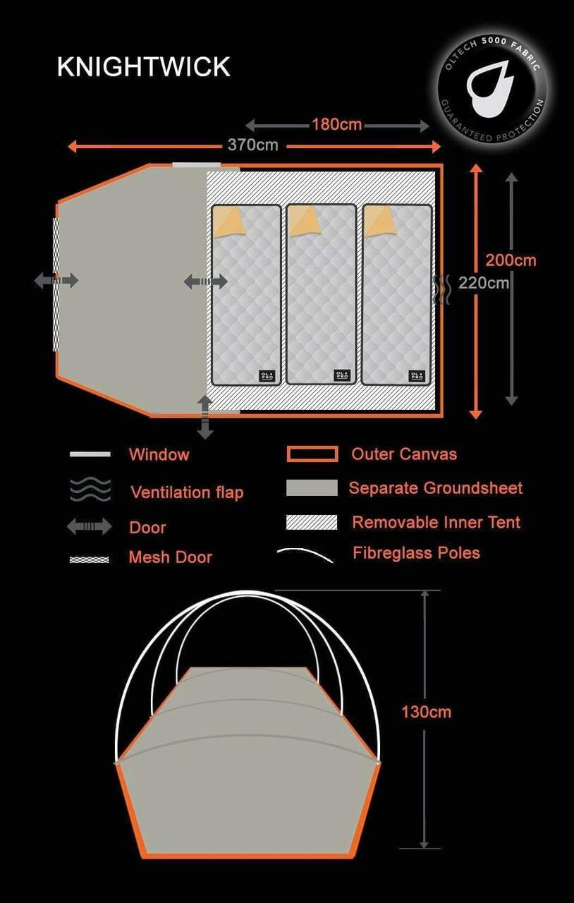 The Knightwick by OLPRO is a spacious three-berth tent perfect for festivals or small family camping trips. It has a fully sewn in groundsheet, large porch area for storage, and a separate bedroom inner tent. It has two doors, a window and a rear vent allowing plenty of ventilation with mesh fly screens for added privacy and to protect you from those pesky bugs. The front door can be converted into a canopy with the steel canopy poles included to add a little more space when the weather is nice. The waterproof Ripstop fabric with 5,000mm H/H will keep you safe and dry in all weather.