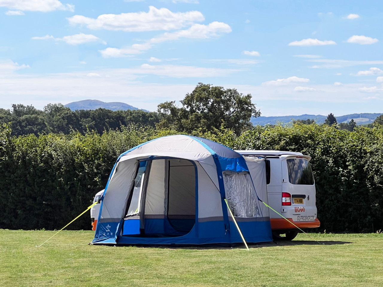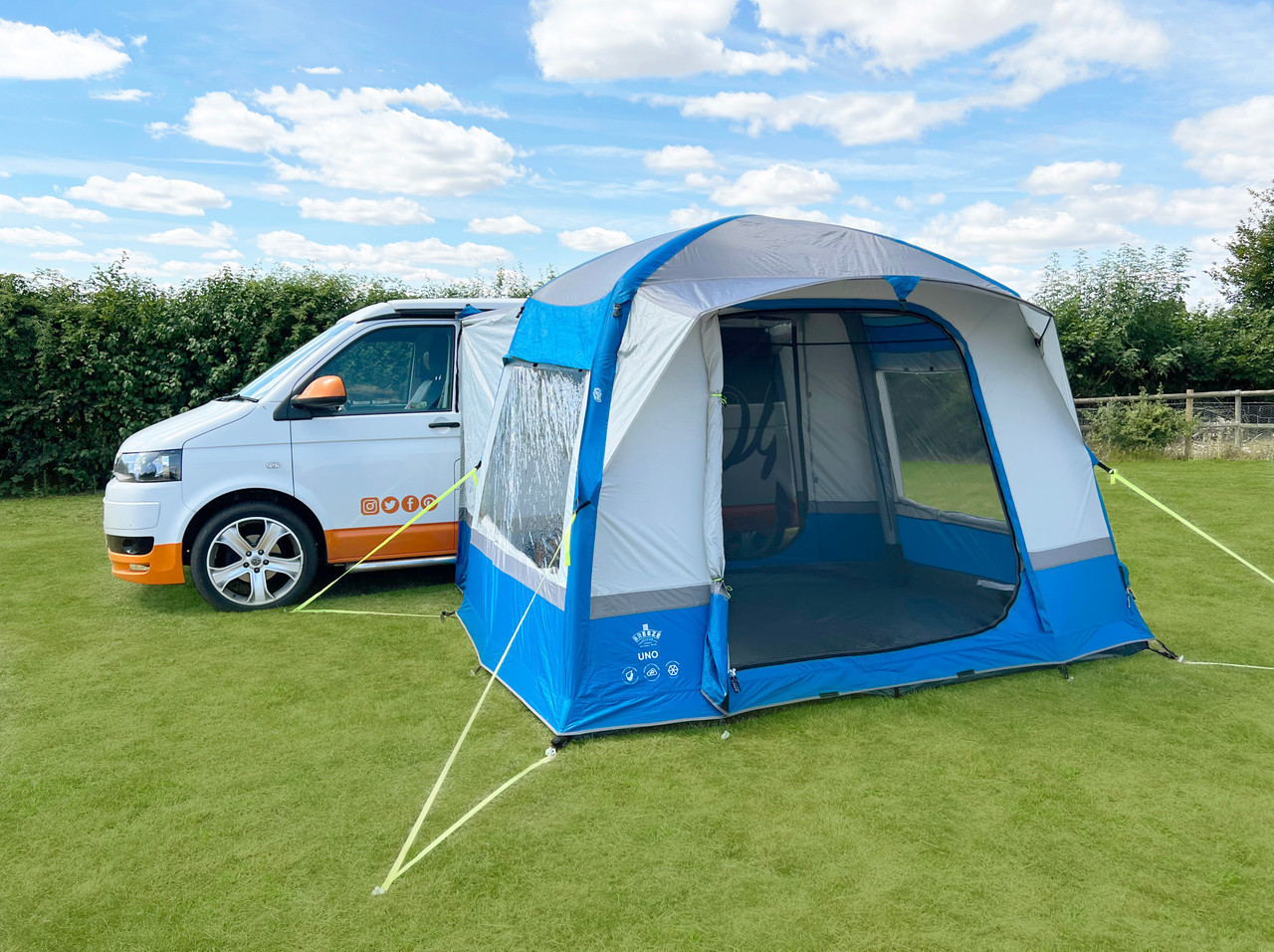 The Uno Breeze® Drive away Campervan Awning is the smallest awning by OLPRO and is the perfect size to store bikes, tables and chairs or for space for pets. It has a sewn-in ground sheet so it can be used as a sleeping or living area too. It has two large windows on either side of the awning and a large door on the front with a canopy to add a little more protection from wet weather.