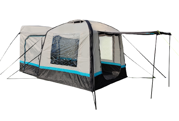 The Snug Inflatable tailgate awning is a driveaway awning perfect for couples or solo campervaners who want an extra sheltered space ideal for cooking, or just for sitting/storage in unfair weather. Designed with tailgate campervans in mind, the awning quickly attaches to your vehicle using your throw over straps or using an awning rail.